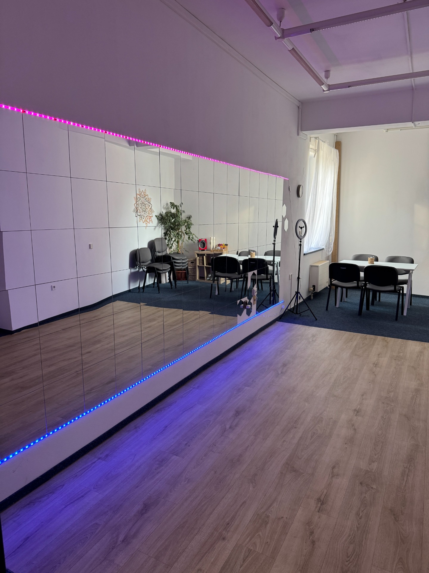 K dispozici máme pro vás připravený projektor, Wi-fi, Bluetooth reproduktor, 30 židlí, žebřiny náležící k taneční ploše, taneční plochu, zrcadlovou zeď.